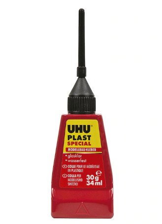 UHU plast spezial is a special adhesive for bonding polystyrene parts and a variety of other plastics in model making. The very fine metal cannula allows for economical and precise application of adhesive, even in hard-to-reach places. UHU plast spezial is very thin and forms a tough, elastic, crystal-clear adhesive film.
