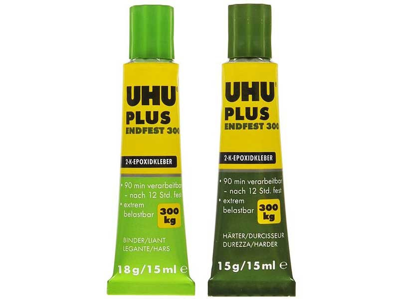 2-component epoxy resin adhesive: a solvent-free, two-component epoxy resin-based adhesive for extreme loads. The working time is up to 120 minutes. UHU plus endfest 90min is extremely versatile, especially when the joint must withstand extreme loads. The mixing ratio is usually 1:1 binder and hardener (by volume). After mixing, there is a limited time – the pot life – for processing the adhesive. In addition to a high final strength (up to 3000 N/cm²), the bond is characterized by very high impact resistance, aging resistance, and moisture resistance.